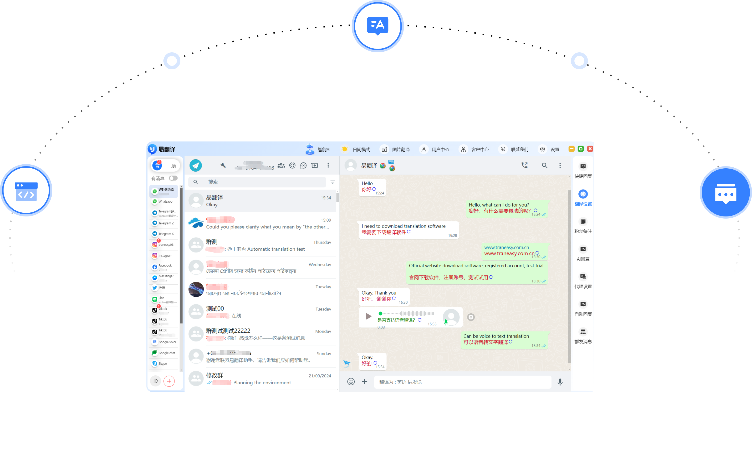 易翻译集成了whatsapp/line/zalo/telegram等全球主流社交软件
